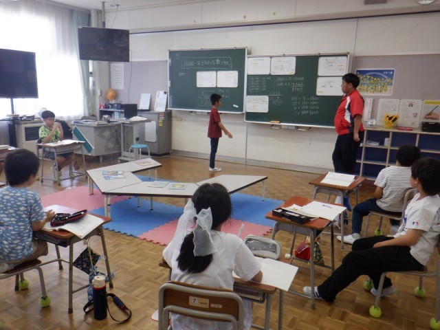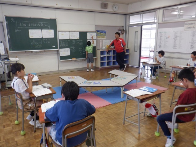 3年生は算数科で大きな数の学習をしています。「16000」という数について、「20000より4000小さい」「1000を16個集めた」等様々な表し方を子供たちが考えました。数についての理解がより深まりました。