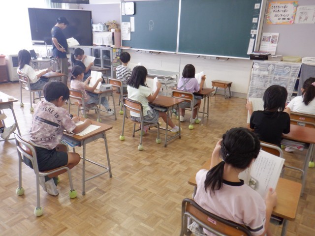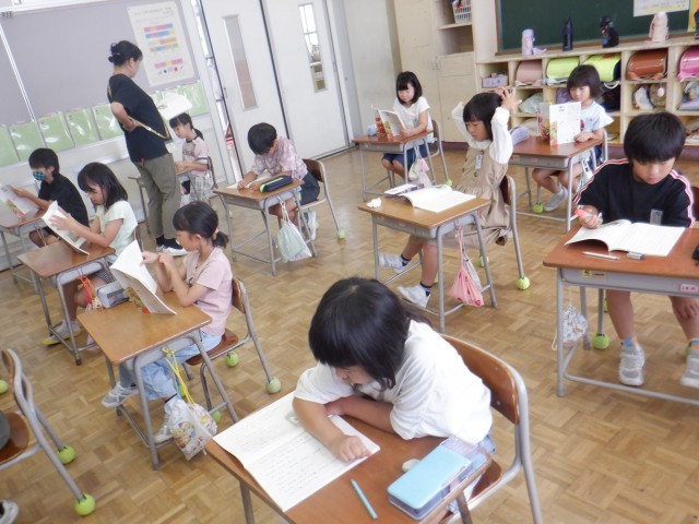 2年生も国語の下の教科書の学習をしていました。最初に出てくる「お手紙」というお話をみんなで音読しています。