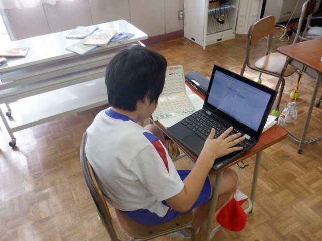 3年生は国語科でパソコンで文章をつくっていました。ローマ字を学習しているので、パソコンの入力もローマ字入力です。ローマ字表を片手に一生懸命入力していました。