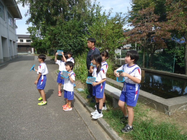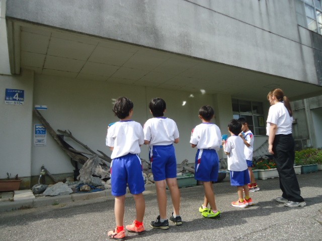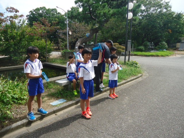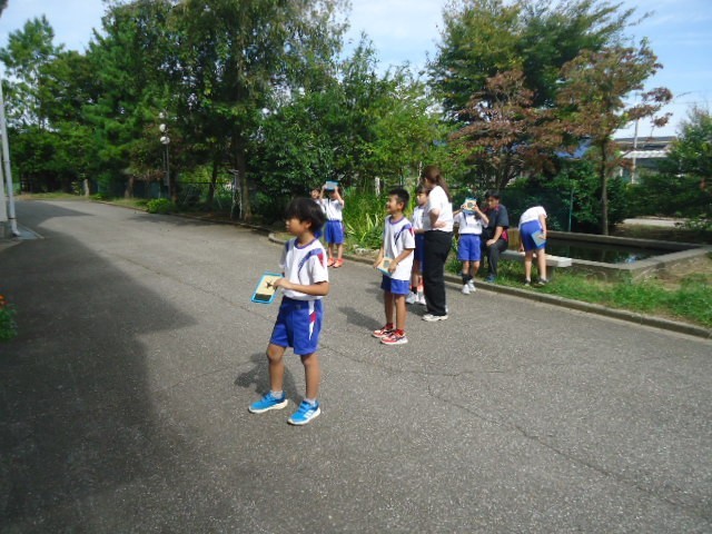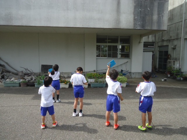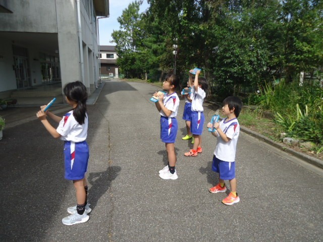 「日光はかがみに当たるとはねかえるよ。」はねかえった光を場所を変えたり、形を変えたりして、壁に映してみました。