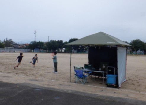 天候不良のため延期となっていたPTA主催のスクールオブキャンプを行っています。雨風が心配なため、グラウンドと体育館を利用してのキャンプを行っています。子供たちもいつもと違う雰囲気を楽しんでいます。