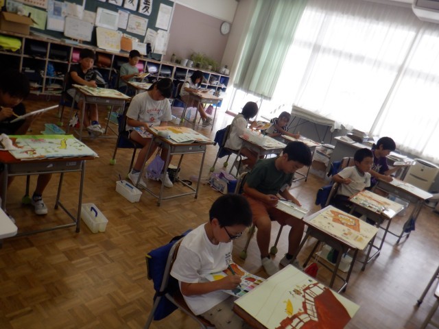 4年生が図画工作科で取り組んでいる「ごんぎつね」の絵の製作が進んでいます。水の量を変えて色の濃淡をつくりながら、背景と手前にあるものを塗り進めています。