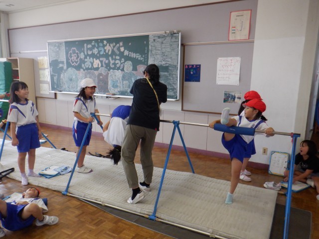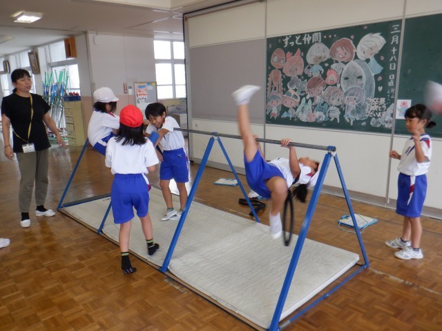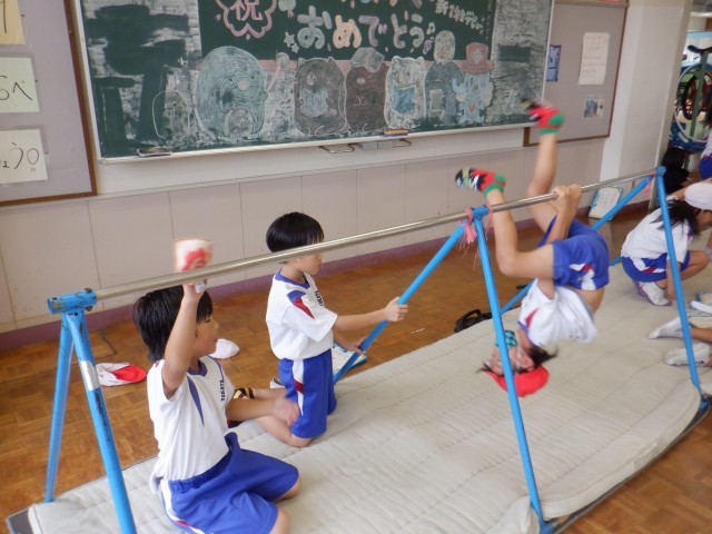 2年生は体育科で鉄棒の練習をしていました。鉄棒カードに書いてある技を自分で選んでどんどん練習しています。できる技が増えて子供たちもやる気を出してがんばっています。