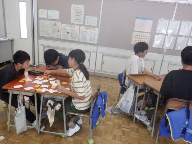 6年生は国語科で熟語の成り立ちの学習をしています。「高+性能」「銀河+系」等、2字の頭や後ろに1字を付けることで出来ている熟語について、神経衰弱のルールで漢字を組み合わせるゲームをしていました。楽しみながら熟語の構成について学んでいます。