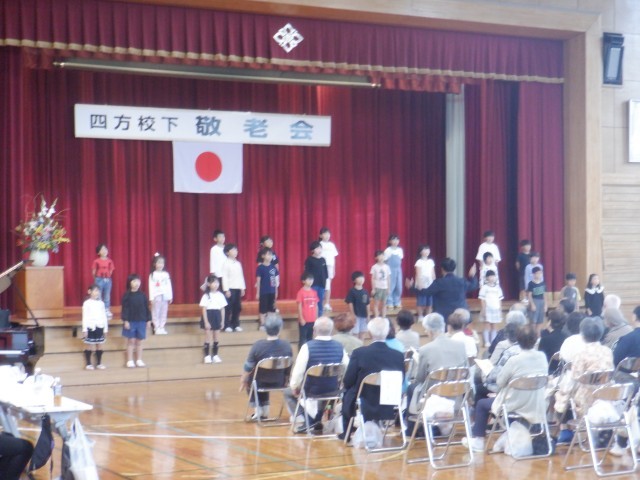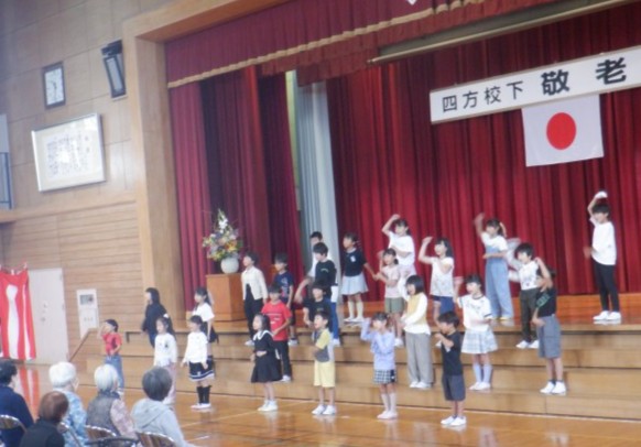 1、2、3年生が四方校下敬老会のステージ発表をしました。3曲を元気に歌い、体育館がたくさんの笑顔と拍手に包まれました。