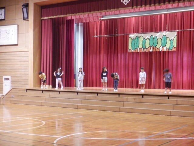 1年生は学習発表会の練習をステージでしていました。明日の校内発表会に向けて、細かな動きの練習をしていました。