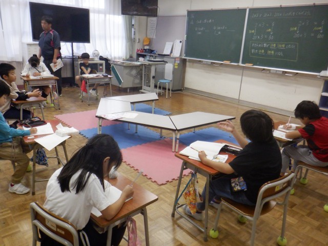 3年生は算数科で大きな数を工夫して計算する練習をしていました。「4×6」の九九を利用して「40×6」「400×6」の計算をしました。「できた!」「わかった!」子供たちの中からうれしそうな声が聞こえました。