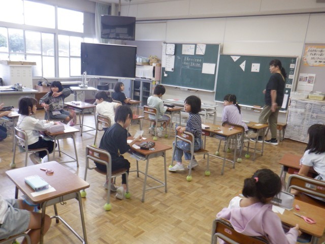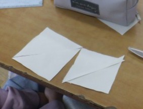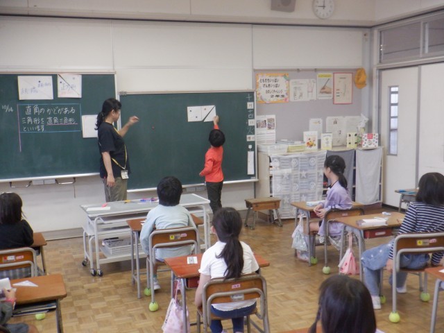 2年生は算数科で「直角三角形」という図形を学習しました。直角三角形を使って正方形や長方形をつくることで直角三角形の性質に目を向けていました。