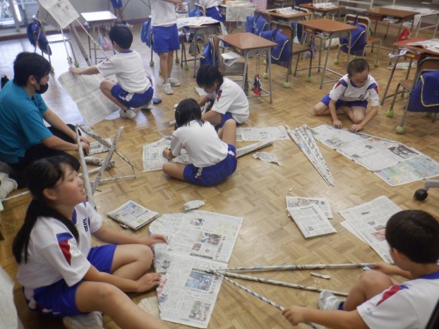 4年生は図画工作科で、新聞紙を使った製作をしていました。丸めて様々な太さの棒をつくったり、広げて棒の上にのせたりして様々な立体物をつくっていました。
