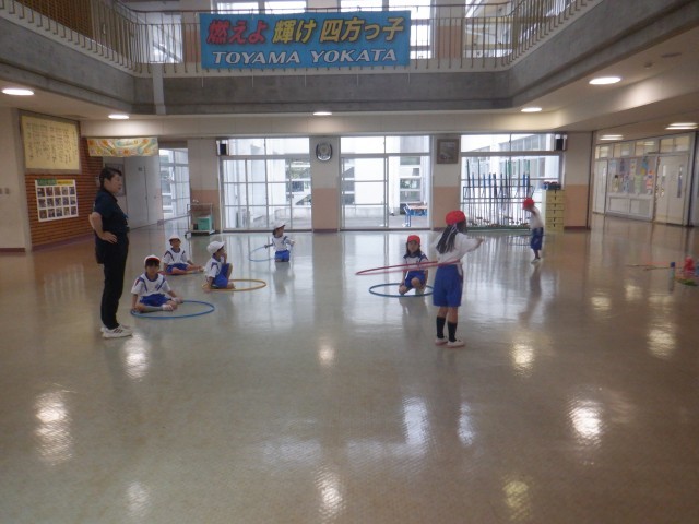 1年生は体育科でフラフープ遊びをしていました。腰で回したり、縄跳びのように跳んだりと楽しく体を動かしていました。