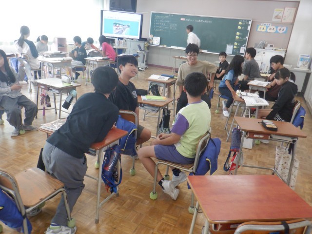 6年生は理科で地震について学習していました。町のイラストを見ながら、地震が起きたらどうなるのか、どんな危険があるのかを友達と一緒に考えていました。