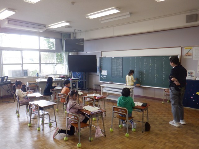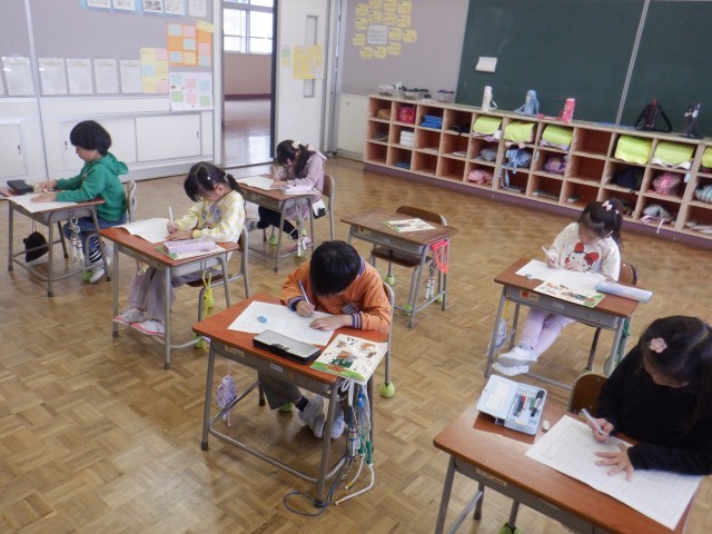 1年生は国語や書写の学習で、文のきまりについて学習しています。文の最初は1マス開ける、最後は「。」をつける、「を」「お」「へ」「え」を正しく使うなど様々な決まりに気を付けて、間違い探しをしたり文章を書いたりしました。