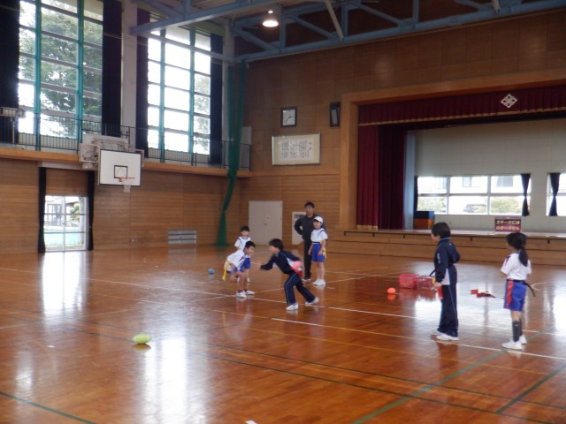 3年生は体育科でタグラグビーをしていました。1対1で、ボールを持ちながら相手をかわす練習をしています。タグを取られないよう、左右に動きながら走っていました。