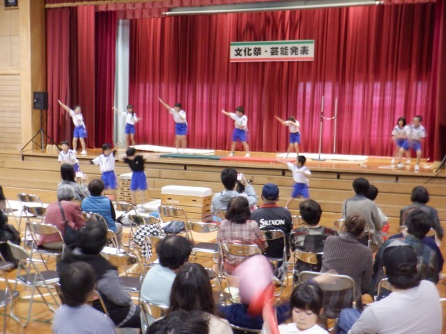 四方校下の文化祭で4年生が器械運動の発表を行いました。マットや跳び箱の技を決める度、客席から拍手や歓声が起き、子供たちは張り切って演技をしていました。