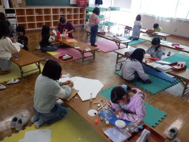 2年生は生活科でおもちゃをつくっていました。つくりたいおもちゃの設計図をつくり、箱や紙皿、折り紙等必要なものを準備して早速製作活動に取り組んでいます。一人一人つくるものは異なりますが、みんな集中してがんばっていました。