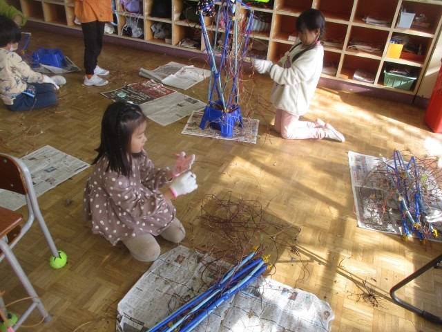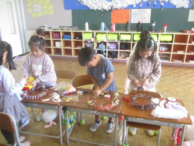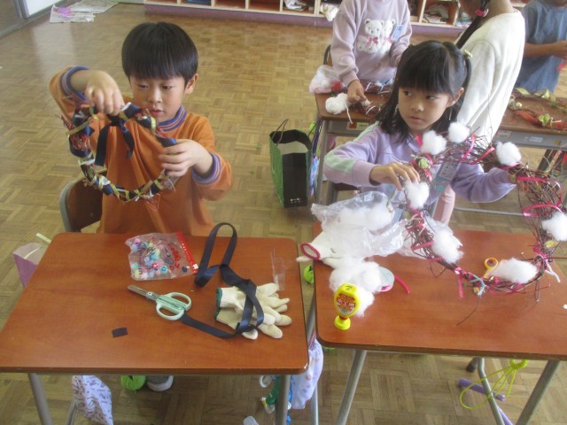 生活科の時間に、アサガオのつるでリースを作りました。支柱からつるを外すことにとても苦労しましたが、進んで友達を助けている姿が見られてうれしく思いました。リボンや綿で飾り付けをし、素敵なリースができました。