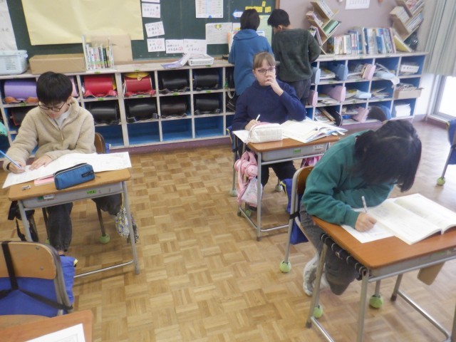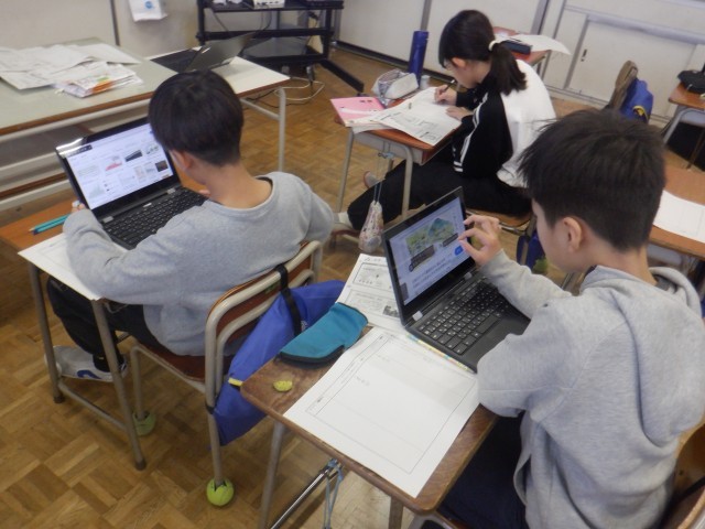 5年生は国語科で意見文を書く学習をしていました。教科書の意見文を読むことで文の構造を学び、それを生かして自分の意見文を書きます。地球温暖化や大気汚染、ごみ問題等身近なテーマを取り上げ、資料を調べたり、友達と意見交換したりして書く内容を考えていました。