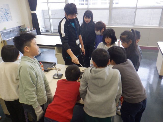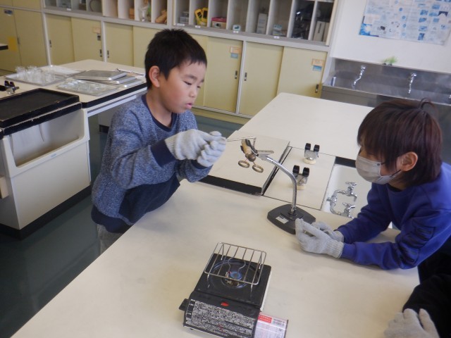 4年生は温度による金属の体積の変化について実験をしていました。熱した鉄球、冷やした熱球をそれぞれ輪に通して体積に変化があるかを調べます。安全に気を付けながら実験に取り組んでいます。