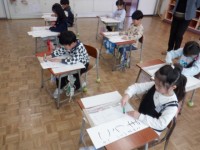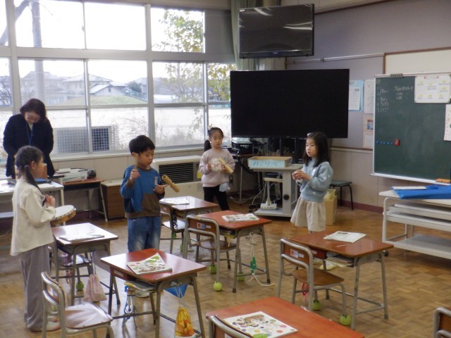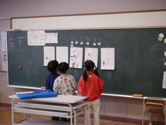 1年生は音楽科でクリスマスの歌を歌っていました。自分たちで書いた歌詞カードを見ながら歌ったり、歌に合わせて楽器を鳴らしたりと、楽しそうです。