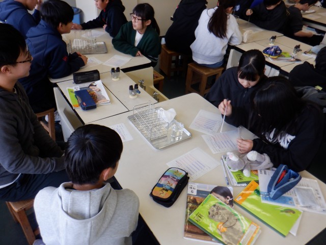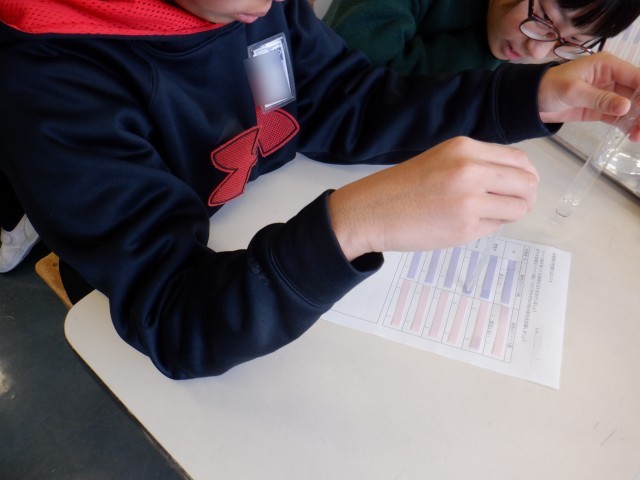 6年生は理科で、リトマス紙に様々な溶液をつけてリトマス紙の変化を調べました。溶液によって、色が変わるリトマス紙が異なったり、近付けただけで色が変わったりするものもあり、子供たちは驚きの声をあげながら変化を確認していました。