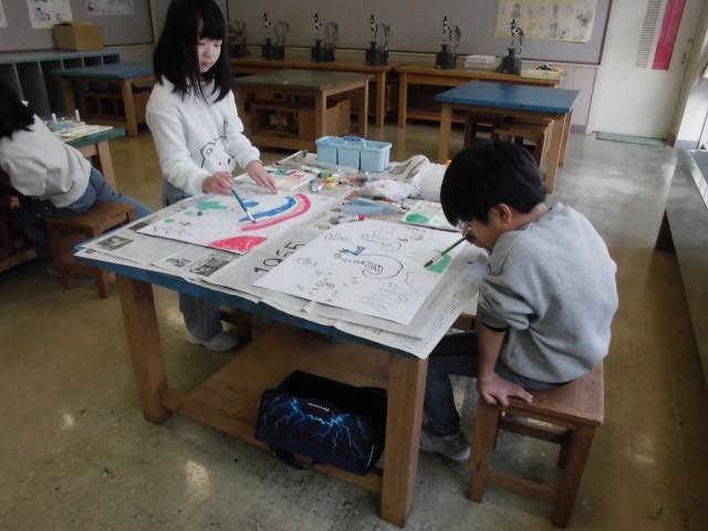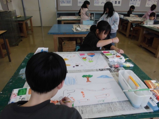 今日の図画工作科は先生に読んでもらったおはなしから思い浮んだことや、自分で考えたおはなしの続きを絵にあらわしました。絵具で色もぬって、おはなしからいろいろなものが生まれました。