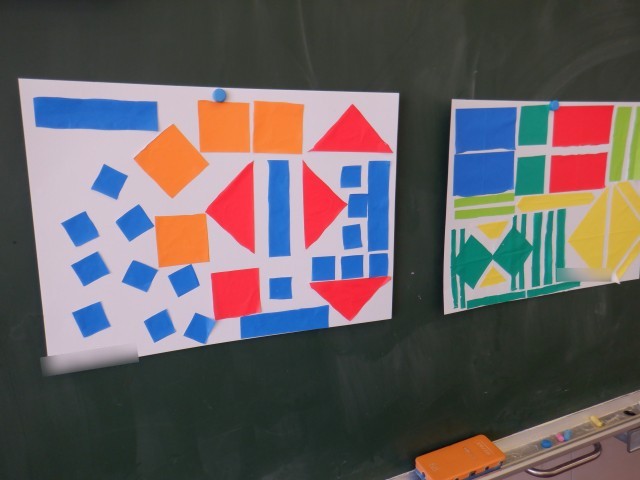 1年生は算数科で形の学習をしています。三角、四角の形を使って、模様をつくったり、家や観覧車等をつくったりと楽しみながら形の学習をしていました。
