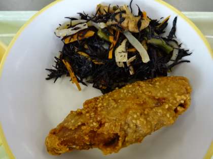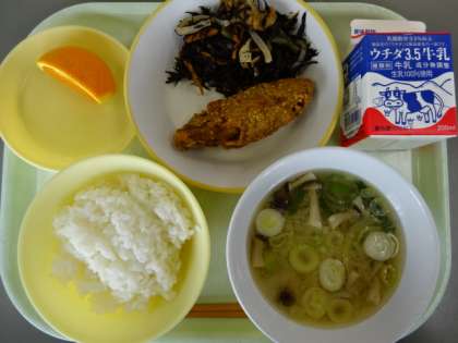 今日の献立は、「魚の利休揚げ、ひじきの炒め煮、ご飯、味噌汁、牛乳、清見オレンジ」でした。