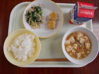 今日の給食の献立は、ごはん、牛乳、にんじんシューマイ、しおナムル、マーボー豆腐です。どれもおいしくいただきました。