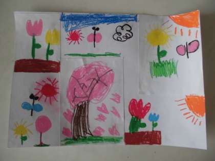 グラウンドで見つけた春をスケッチしました。それを大きな画用紙に貼り、イメージを膨らませて作品を完成させました。