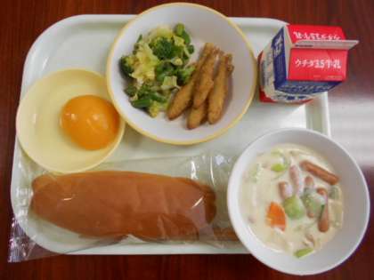 今日の献立は、「米粉コッペパン、牛乳、わかさぎのフリッター、グリーンサラダ、クリーム煮、ももかん」でした。