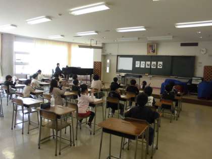 2枚目の写真は宍戸先生と音楽の授業をしているところです。「子犬のBINGO」と「ロンドンばし」の学習をしています。