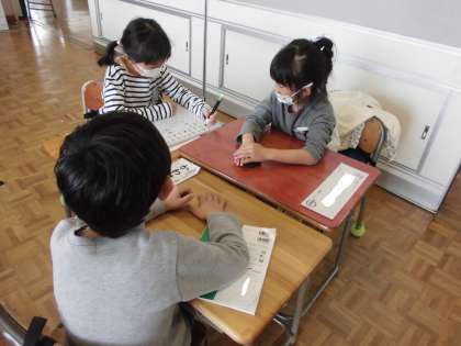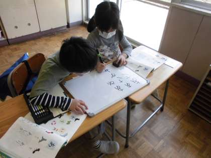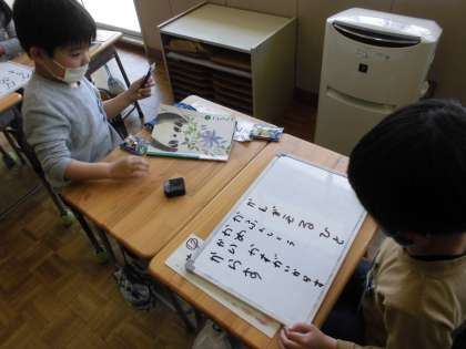 ペアやグループでホワイトボードを使って「あ」から始まる言葉と「か」から始まる言葉を出し合いました。最後に全部のホワイトボードを黒板に貼ってみんなで見つけた言葉を確認しました。いろいろな言葉が出てきて楽しかったです。