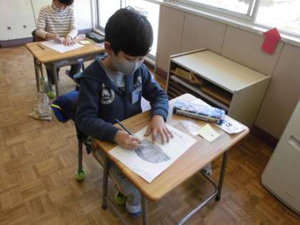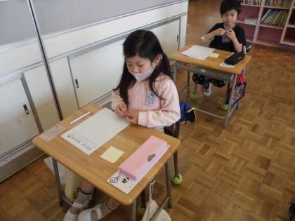 あさがおの種の観察カードを書きました。小さな種を落とさないようにじーっと見ながら絵や気づいたことを書きました。「すいかみたいなかたちだったよ」「はやくさくといいな」「ここがかわいい」など、思い思いに書いた子供たちです。種を植えるのが楽しみですね。