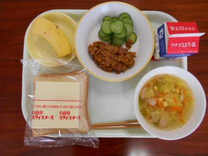 5月11日(火)の給食は、「食パン、牛乳、チリコンカン、きゅうりもみ、キャベツスープ、バナナ、スライスチーズ」でした。
