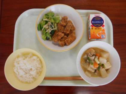 5月12日(水)の給食は、「ごはん、オレンジジュース、イカのかりん揚げ、もやしのおひたし、豚肉と大根のごま味噌煮」でした。