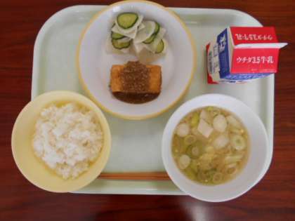 5月14日(金)の給食は、「ごはん、牛乳、揚げ出し豆腐のごまだれかけ、かぶのレモン和え、つみれじる」でした。