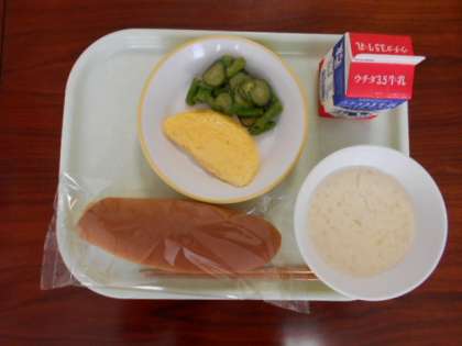 5月18日(火)の給食は、「米粉コッペパン、牛乳、オムレツ、グリーンサラダ、ビーンズポタージュ」でした。