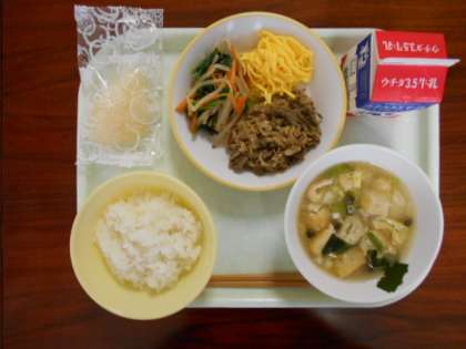 5月19日(水)の給食は、「ごはん、牛乳、ビビンバ(焼き肉、ナムル、錦糸卵)味噌汁、冷凍ラフランス」でした。