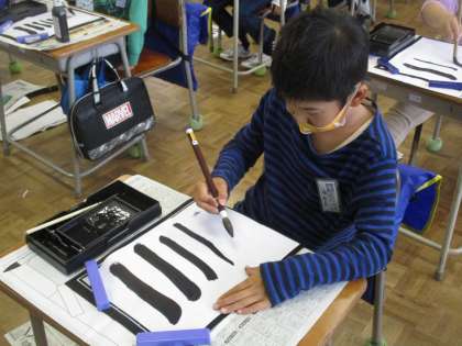 墨汁をつけての書写は、今日が初めてでした。みんな、準備や後片付けまで、集中して取り組んでいました。筆の使い方はまだまだ未熟ですが、「一生懸命がんばろう」という意欲が伝わるステキな時間でした。保護者のみなさま、お手数ですが、本日の宿題に「筆洗い」を出してあります。子供たちだけでは難しいと思うので、ぜひ、一緒に手伝ってあげてください。よろしくお願いいたします。