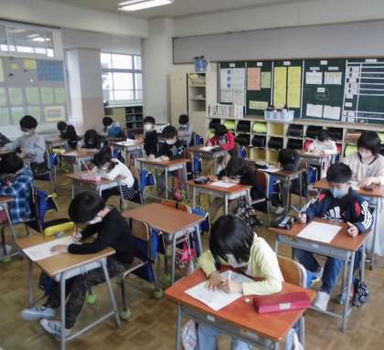 2年生は、1限目に「紅はるか」という種類のさつまいもの苗を植えました。土にななめに開いた穴に折れないように大事に植えました。