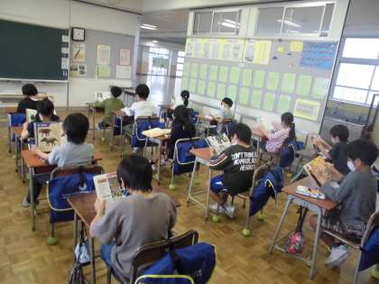 集中して読んでいるので、教室は静まりかえります。たくさん借りている子供も多く、年間30冊の目標に達した子供も、たくさんいます。本の世界にひたっている子供たちの姿は、とても素敵です。