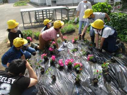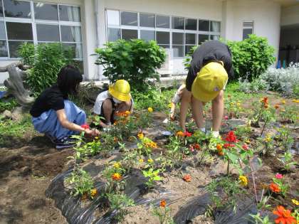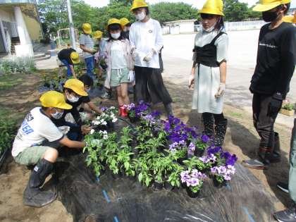 総合的な学習の時間「四方 笑顔いっぱいプロジェクト〜花壇作り〜」で、見る人が明るい気持ちになるような花壇を作ろうとしています。