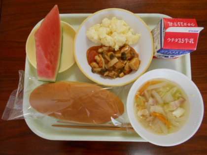 6月8日(火)の給食は、「コッペパン、牛乳、鶏肉のトマト炒め、チーズポテト、マカロニスープ、すいか」でした。