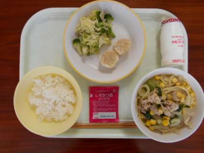 6月10日(木)の給食は、「ごはん、札幌ラーメン、かにシューマイ、ブロッコリーサラダ、しそかつおふりかけ、のむヨーグルト」でした。