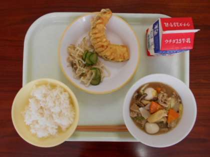 6月11日(金)の給食は、「ご飯、牛乳、八宝菜、カボチャの天ぷら、甘酢和え」でした。カボチャの天ぷらが甘くておいしかったです。