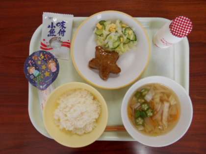 7月2日(金)の給食は、「ごはん、飲むヨーグルト、星形ハンバーグ、コーンサラダ、天の川スープ、七夕デザート、味付け小魚」でした。