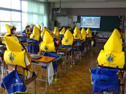 ライフジャケットは、児童全員分を寄贈いただいたので、一人一人が実際にライフジャケットを着用してみました。フードも付いていて、地震の際に着用すれば、頭も守ってくれます。