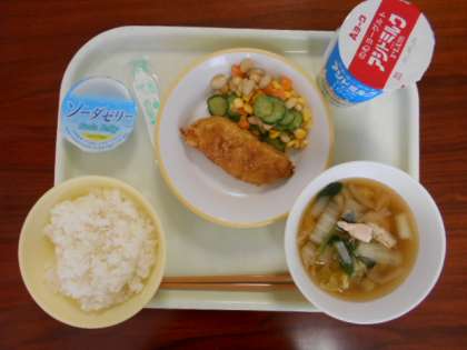 7月7日(水)の給食は、「ごはん、飲むヨーグルト、★魚のカレー揚げ か ハムチーズフライ、甘味噌和え、具だくさんじる、★ソーダーゼリー か シークワーサータルト」でした。