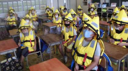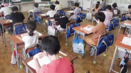 避難訓練では、ライフジャケットの着用の練習をしました。1学期の学習のたしかめテストも真剣に取り組みました。生活科で育てている野菜の畑では、たくさんの野菜が実り、毎日たくさん収穫しています。大切に世話をしている姿がとても素敵な2年生です。