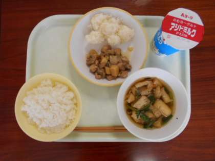 7月14日(水)の給食は、「ご飯、飲むヨーグルト、あっさりチキン、粉ふきいも、沢煮椀」でした。